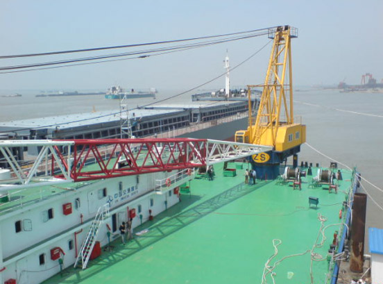 由中交二公局集團承建,采用中昇建機ZSF2700(271000)船式起重機(柴油驅(qū)動中國船級社CCS認證),最大吊重27m處吊100t,已于2008年二月于江蘇省江都港口舉行下水儀式且已正式啟用,此一船吊為我公司又一成功之大起重量起重設(shè)備。
