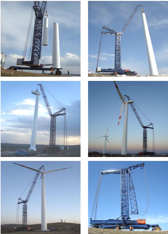 我公司自主研發(fā)的第一臺輪胎行走式風電吊機于2008年9月交付使用,於內(nèi)蒙古察右中旗風電項目由天津電建順利完成現(xiàn)場吊裝任務,此一風電吊機采用輪胎式行走,具有轉(zhuǎn)場便利、抗風性強吊裝穩(wěn)定、起升高度高、起重量大等優(yōu)點,此風電吊機采用柴油引擎驅(qū)動,最大爬坡30%,行車速度0~5km/h,最大起升高度90m,最大吊重80t(15m處) ,可滿足所有1.5兆KW風電機租吊裝要求。
