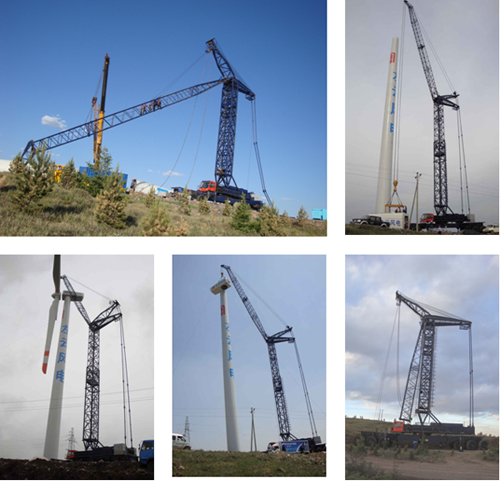由我公司自主研發(fā)的第二臺(tái)風(fēng)電專用吊機(jī)於2009年5月交付現(xiàn)場(chǎng)使用,於山西左云風(fēng)電項(xiàng)目由天津電建公司克服了惡劣的路面環(huán)境順利完成現(xiàn)場(chǎng)吊裝任務(wù),第二臺(tái)風(fēng)電吊機(jī)起升高度可達(dá)90米,最大吊重可達(dá)80噸(15m處),可滿足1.5~2.0兆kw風(fēng)電機(jī)組吊裝要求。