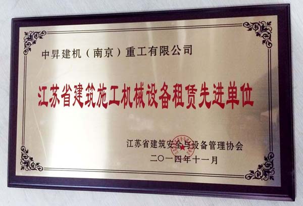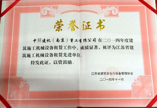 2014年11月中昇建機(jī)(南京)重工有限公司因優(yōu)秀的設(shè)備管理水平被江蘇省建筑安全與設(shè)備管理協(xié)會評為“江蘇省建筑施工機(jī)械設(shè)備租賃先進(jìn)單位”榮譽(yù)稱號,并頒發(fā)了證書和獎?wù)隆?