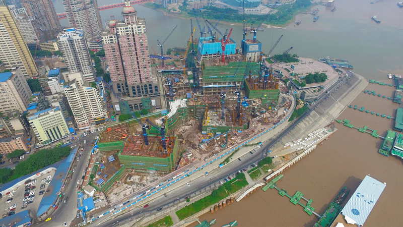 重慶來福士廣場的8座塔樓,2座施工高度220m,4座施工高度248m,2座施工高度348m,采用中昇建機(jī)ZSL1700(80T)一臺,ZSL1500(64T)一臺,ZSL1000(64T)一臺,ZSL750(50T)四臺,ZSL500(32T)六臺,ZSL380(32T)六臺。
