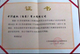 中昇建機(jī)被江蘇省建筑安全與設(shè)備管理協(xié)會評為2013度“AAA級信用等級企業(yè)”