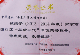 中昇建機(jī)被授予2013—2014年度南京市浦口區(qū)“三信三優(yōu)” 單位榮譽(yù)稱號
