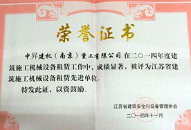 中昇建機(jī)被評為2014年度“江蘇省建筑施工機(jī)械設(shè)備租賃先進(jìn)單位”榮譽(yù)稱號